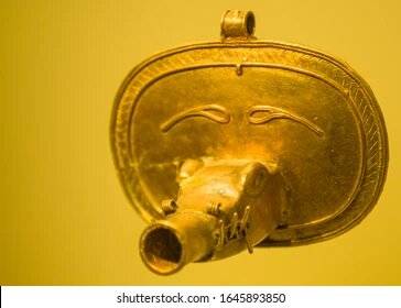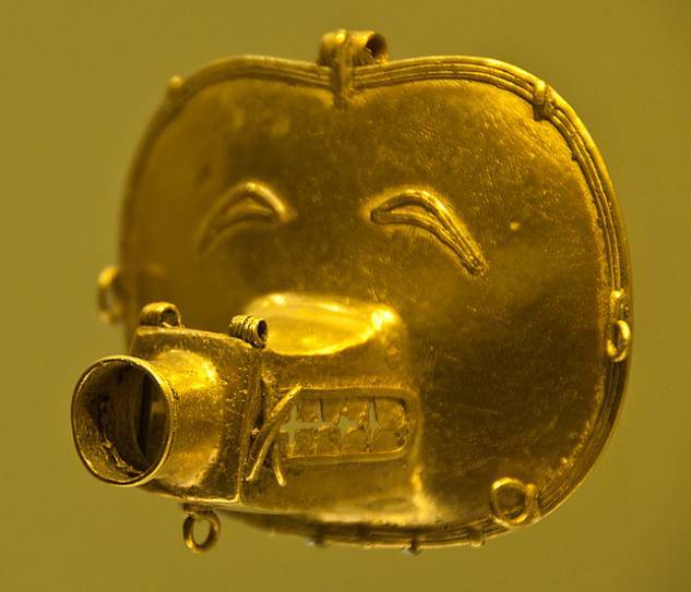 На изображении представлено золотое пекторальное (нагрудное) украшение культуры Йотоко (Калима), датируемое I–VII веками н.э.