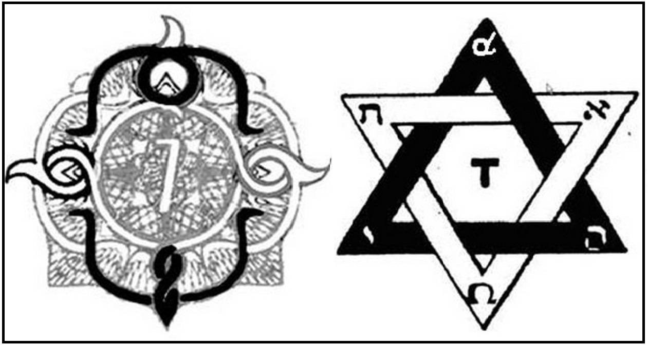 Получающаяся от взаимного пересечения новая геометрическая фигура шестиконечной звезды должна означать замену имени Божия (треугольника) именем новым, именем того, кто был последним (омега), а стал всем ((альфа)и (омега) — первый и последний), ибо обе эти буквы входят в состав одной фигуры звезды. Кто этот последний мы теперь знаем. Сатана имя ему.