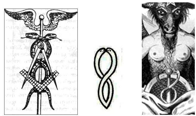 В нижней части каббалистической «печати» расположены две переплетенные змеи Кадуцей — это также элемент символики масонства (которое на Руси всегда называли «ЖИДо-масонством»). Кадуцей на рисунке Бафомета обвивает его фаллос. Одна змея означает Иуду Искариота, другая змея — Антихриста.