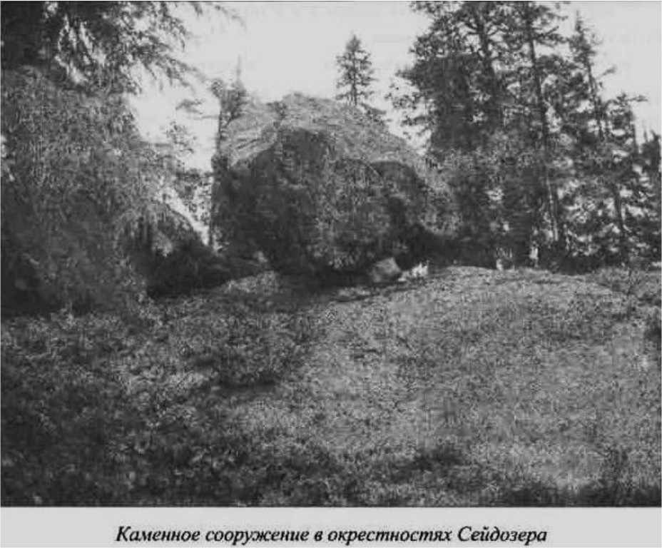 Осень разукрасила склоны вперемежку с лиственницами пятнами серо-зеленого цвета, яркими кущами берез, осин, ольхи; вдали сказочным амфитеатром раскинулись ущелья, среди которых находится Сейд-озеро. В одном из ущелий мы увидели загадочную вещь — рядом со скитами, там и сям пятнами лежащими на склонах ущелья, виднелась желтовато-белая колонна вроде гигантской свечи, а рядом с ней кубический камень. На другой стороне горы с N виднеется гигантская пещера, сажень 200, а рядом нечто вроде замурованного склепа.