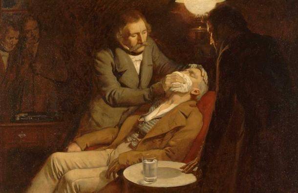 Первое применение эфира в качестве хирургического анестетика в стоматологической хирургии. Картина маслом, написанная Эрнестом Бордом в 1846 году.