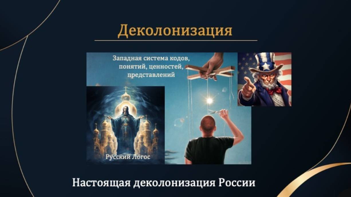 - и наконец, наше время. Это клеймо ещё не написано. Оно пишется сейчас: началась эта эпоха с тотальной катастрофы 1991 года, но Россия выбирается из этой бездны, с огромным трудом возвращаясь к исполнению своей миссии, к своему достойному месту на русской иконе. Вот это седьмое клеймо и должно стать клеймом деколонизации.