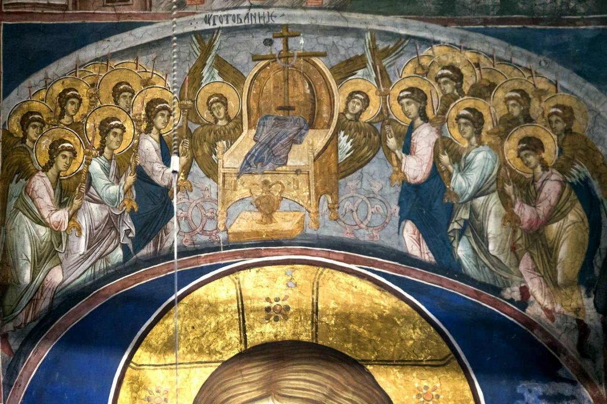 В церковной росписи есть характерный иконографический сюжет: он называется «престол уготовáнный», по-гречески — этимасия. Он изображает трон, на котором нет царя. Вместо этого на нём крест и Евангелие. История этого сюжета такова. Римский (византийский император), покидая столицу, оставлял на своём троне копьё.