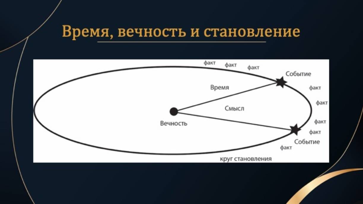 Мы, филологи, историки, философы, аналитики — должны стоять не на территории факта, а на территории вечности, точнее, на стороне посланника Вечности к становлению — Времени. Время — это, как бы, гонец Вечности, посланный в направлении становления, чистой длительности. Мы должны «поставить печать вечности на становление».