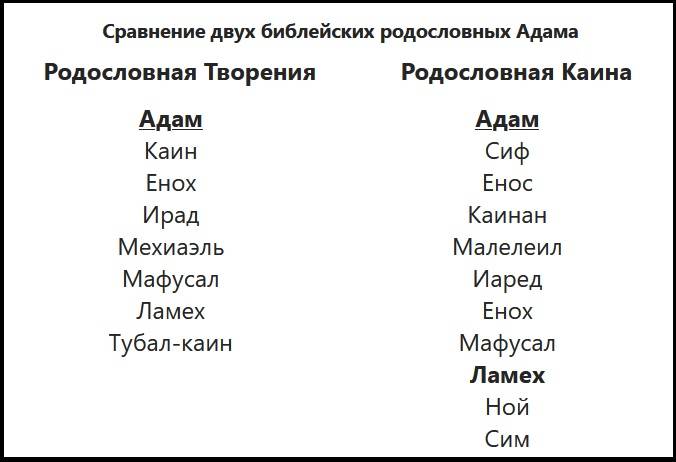 При этом Каин вполне мог быть сыном Люцифера, что мы вот-вот увидим. Имена каждой родословной настолько схожи, отличаясь лишь фонетикой в некоторых случаях, что весьма вероятно, что в обеих родословных это один и тот же Ламех.