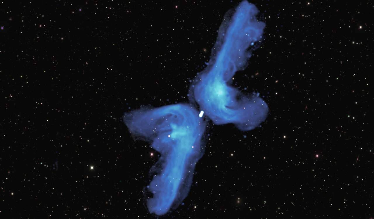 «Двойной бумеранг» Х-образной радиогалактики. Эти большие голубые джеты примерно в 100 раз длиннее всего Млечного Пути. Фото: NRAO/AUI/NSF; SARAO; DES
