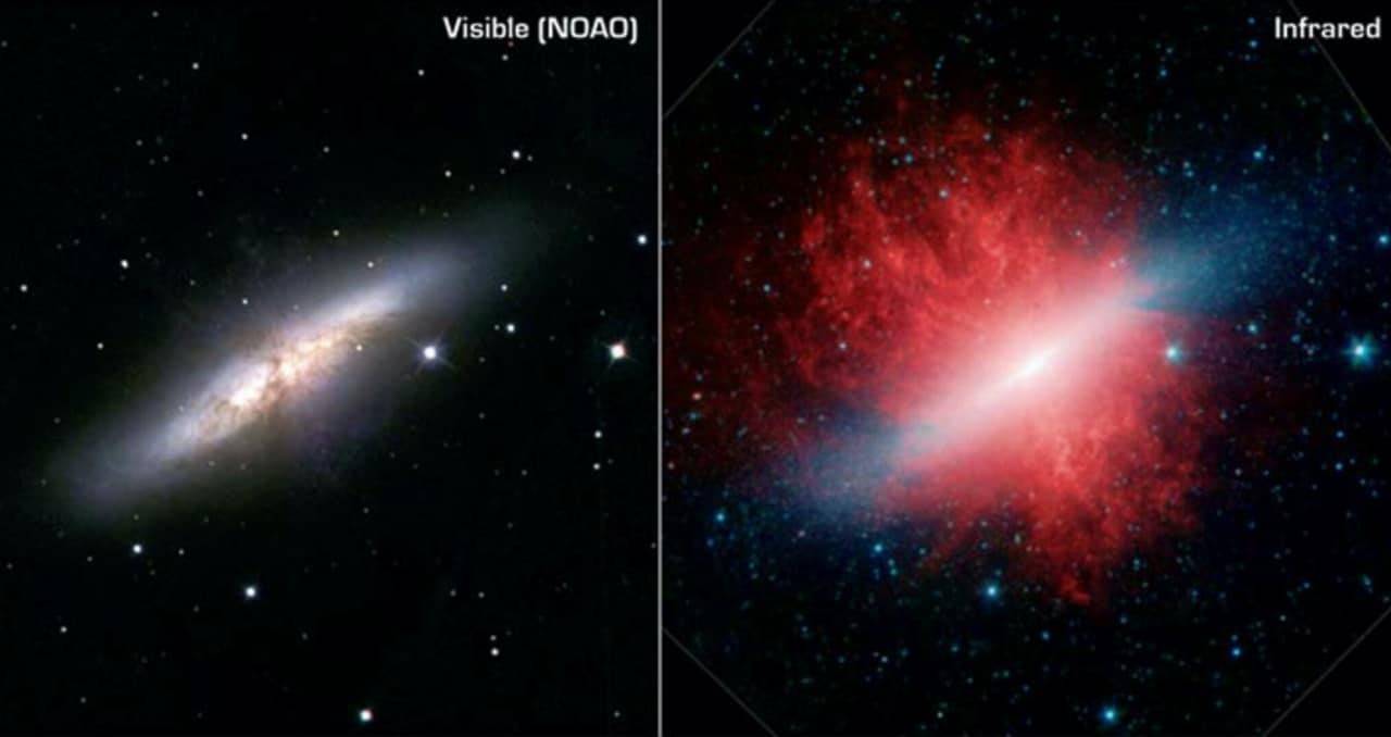 Слева — изображение галактики Мессье 82, полученное в видимом диапазоне. Справа — составное изображение той же галактики, полученное космическим телескопом «Спитцер» в инфракрасном диапазоне. Фото: ESA/NASA/JPL-Caltech/R. Kennicutt