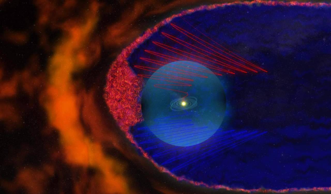 Художественная интерпретация, изображающая гелиосферу в новом свете. Гелиосфера заполнена «магнитными пузырями» (показаны красным цветом), которые заполняют область перед гелиопаузой. Фото: NASA/Центр космических полётов Годдарда/Лаборатория компьютерных исследований
