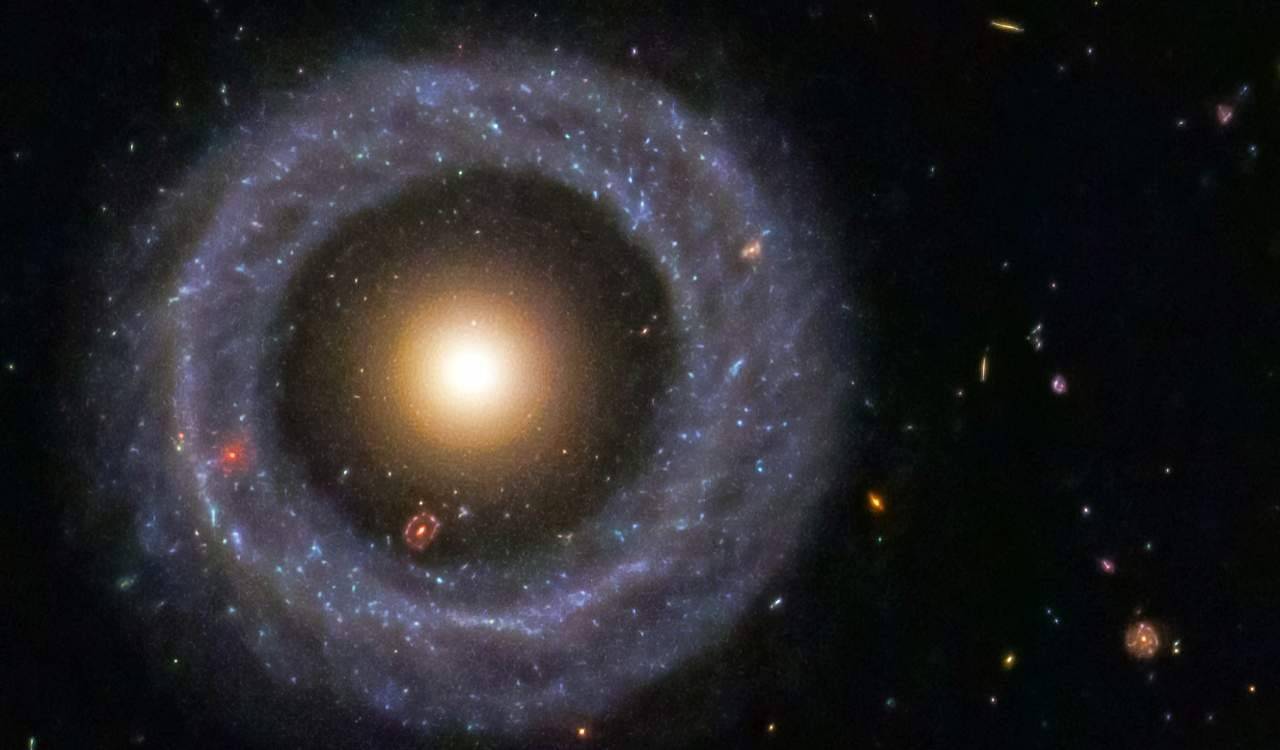 У него есть старое жёлтое ядро, окружённое красивым кольцом из голубых звёзд. Однако в центре ничего нет, как будто кто-то откусил кусок от этой штуки! С другой стороны, она похожа на космический пончик!