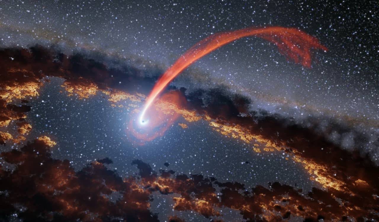 На иллюстрации показан светящийся поток вещества, исходящий от звезды, которую поглощает сверхмассивная чёрная дыра во время вспышки приливного разрушения. Фото: Лаборатория реактивного движения НАСА