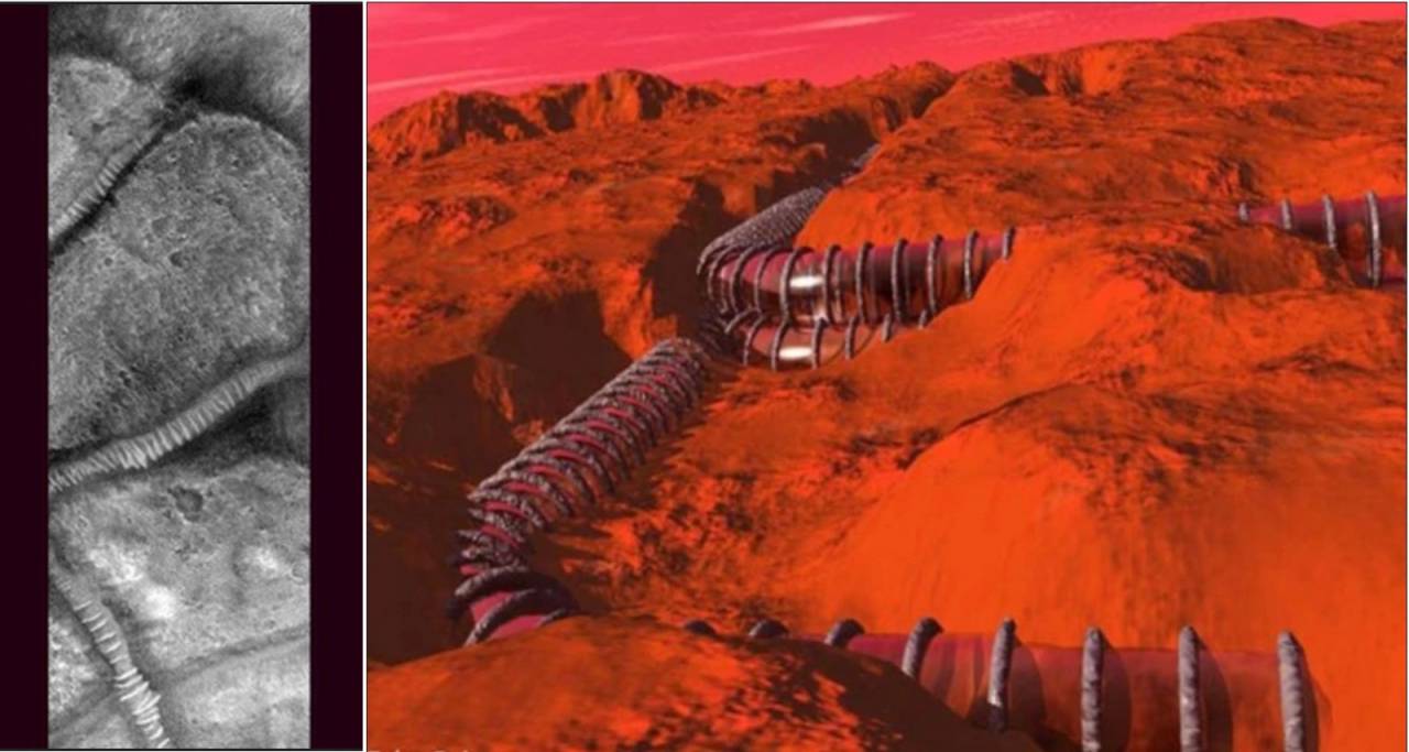 Марсианские структуры, похожие на прозрачные тоннели: снимки с Марса (слева), фантазия художника (справа)