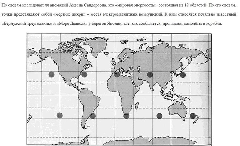 Параллельно на Западе развивались схожие идеи. Иван Сандерсон обнаружил «зоны порочности» — географические точки, где наблюдалась странная активность: исчезновения кораблей, аномалии и необъяснимые явления. Позже исследователи нанесли эти точки на карту и обнаружили удивительную закономерность — они образовывали правильную сетку.