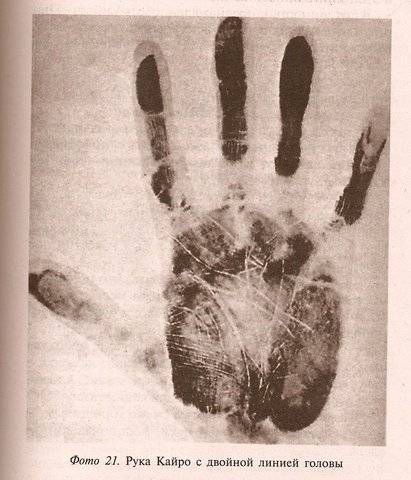 Разрывы на линии головы предупреждали о несчастных случаях, крест на бугре Сатурна, расположенный близко от линии судьбы, был признаком казни за совершенное убийство. Еще одним знаком убийцы Кейро считал утолщенный большой палец в сочетании с короткой и глубокой линией головы, идущей от бугра Марса…
