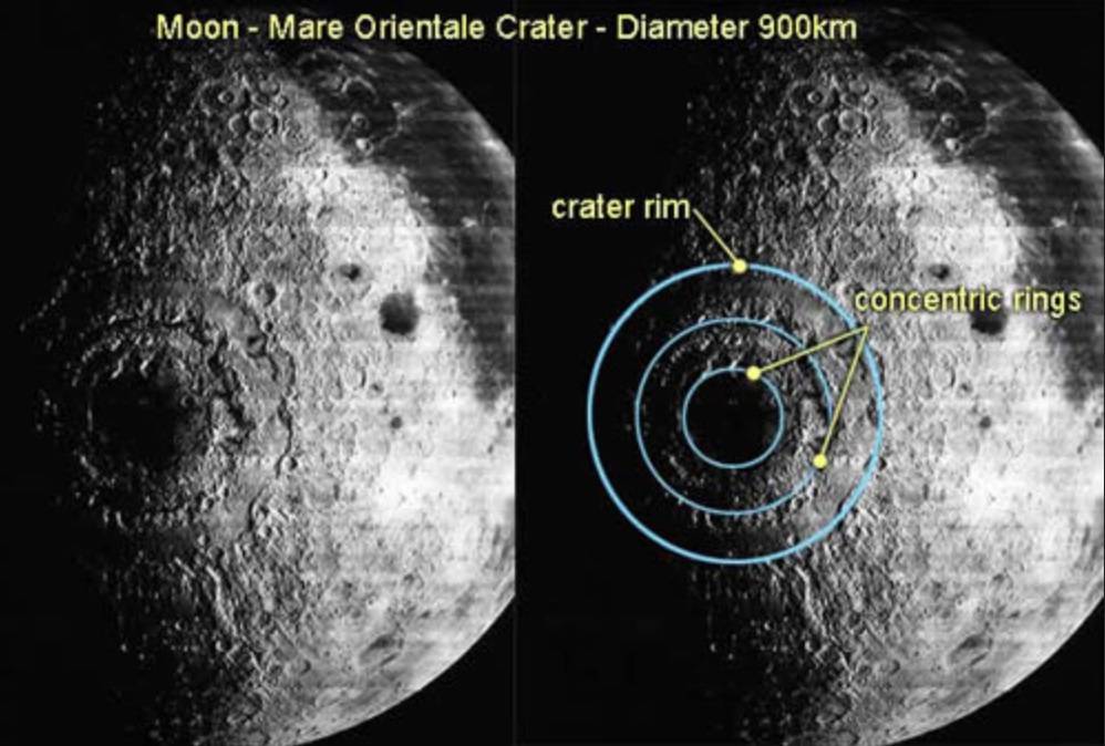Как видно на фотографии выше, дно кратера Восточного моря выпуклое. Он расположен на уровне нормальной кривизны поверхности Луны. «Край кратера» обозначает внешнюю границу ударной «зоны раскопок» (диаметром 900 км). Внутри кратера видны «концентрические кольца». Такая структура может возникнуть только в результате восстановления коры полой планеты. Источник фото: Tlonh.com.