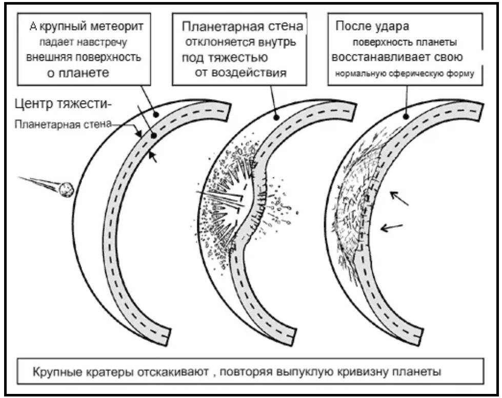 Как видно на фотографии выше, дно кратера Восточного моря выпуклое. Он расположен на уровне нормальной кривизны поверхности Луны. «Край кратера» обозначает внешнюю границу ударной «зоны раскопок» (диаметром 900 км). Внутри кратера видны «концентрические кольца». Такая структура может возникнуть только в результате восстановления коры полой планеты. Источник фото: Tlonh.com.