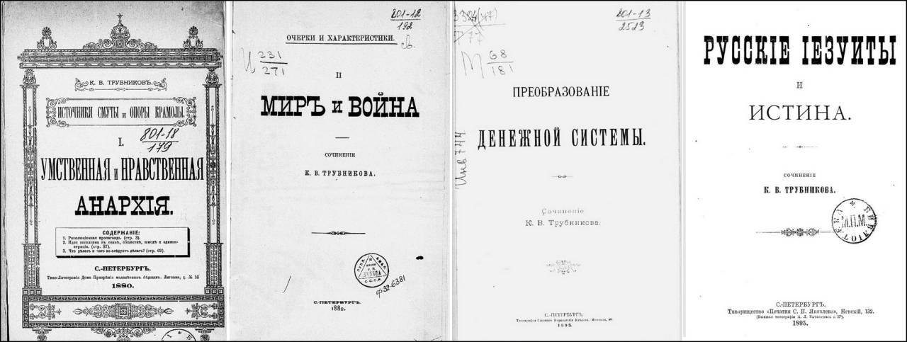 Константин Васильевич Трубников (1829 — 1904), российский журналист и промышленный деятель, инициатор первого русского телеграфного агентства. В публицистике придерживался охранительно-националистических взглядов, все беды России объяснял тлетворным западным влиянием, разоблачал масонство, обвинял государственную цензуру в потворстве радикалам.