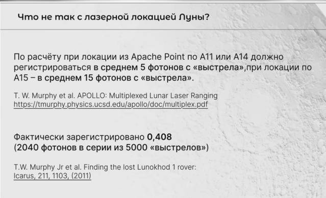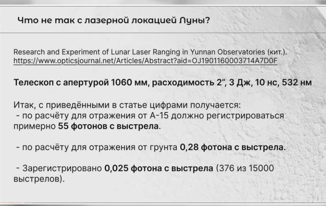 Недавние эксперименты китайцев подтвердили, что уровень отраженных фотонов от «американских» на уровне обычного лунного грунта, т.е. риголита. Уголковые отражатели нашего лунохода (Л1) дают чёткий сигнал, а якобы оставленные отражатели американцев размытый. NASA это объяснило «запылённостью», хотя, скорее, это использование естественных склонов лунных кратеров, выдаваемых за установленные отражатели.