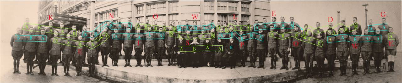 Особо дорогая для Фридмана фотография из 1918 года – с групповым снимком его первого большого курса офицеров-криптографов – это далеко не просто памятный снимок, который он всю жизнь держал на рабочем месте. Это тщательно выстроенное засекреченное послание, демонстрирующее всю мощь бэконовского метода шифрования «у всех на виду». В поворотах головы людей, которые смотрят либо прямо перед собой, либо в сторону, закодированы биты сообщения. Которое, при аккуратном разбиении битов на пятерки, складывается в буквы знаменитого девиза Фрэнсиса Бэкона, ордена розенкрейцеров и множества прочих мистиков-оккультистов древности: «KNOWLEDGE IS POWER», то есть «Знание это сила»…