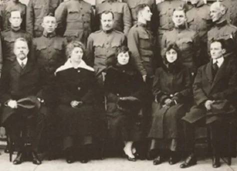Здесь же надо отметить, что приводимая пара фотографий позаимствована из материалов доклада Илонки Данин. Которая на втором, увеличенном фрагменте решила почему-то несколько подрезать коллектив представителей Ривербэнка – аккуратно изъяв из данной картины личность Джорджа Фабиана. То есть собственно организатора всей этой военно-криптографической затеи. Исторически более справедливая версия того же самого фрагмента должна выглядеть так (крайний слева гражданский – Фабиан, крайний справа – Фридман, дама в центре – Элизебет Смит Фридман).