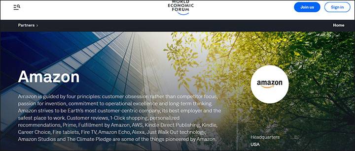 Один из партнёров ВЭФ – Amazon Джеффа Безоса, второго богатейшего человека планеты, уступающего только Илону Маску // Скриншот страницы сайта weforum.org