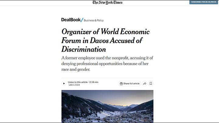 Заголовок гласит: «Организатора Всемирного экономического форума в Давосе обвинили в дискриминации» // Скриншот страницы сайта nytimes.com