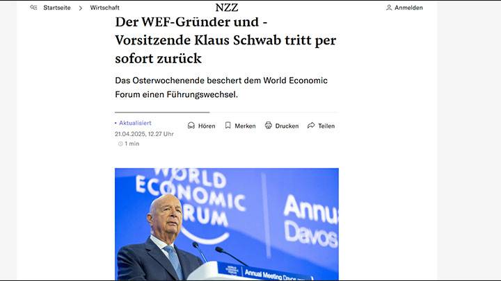 Заголовок гласит: «Основатель и председатель ВЭФ Клаус Шваб срочно уходит в отставку» // Скриншот страницы сайта nzz.ch