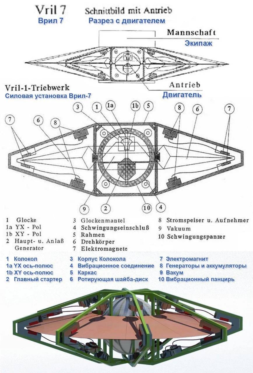 Как это начиналось? По-видимому, все началось с герметических оккультных обществ в Европе в промежуток между мировыми войнами. Медиумы (группы Туле, общества «Вриль» и прочих) получили информацию технического характера от древних цивилизаций (устройство двигателя виманы), либо от инопланетных рас (из созвездия Тельца) и, возможно, также от обитателей адских миров Шаданакара (по терминологии Д. Андреева), с которыми удалось выйти на контакт, словом, от так называемых «умов внешних».