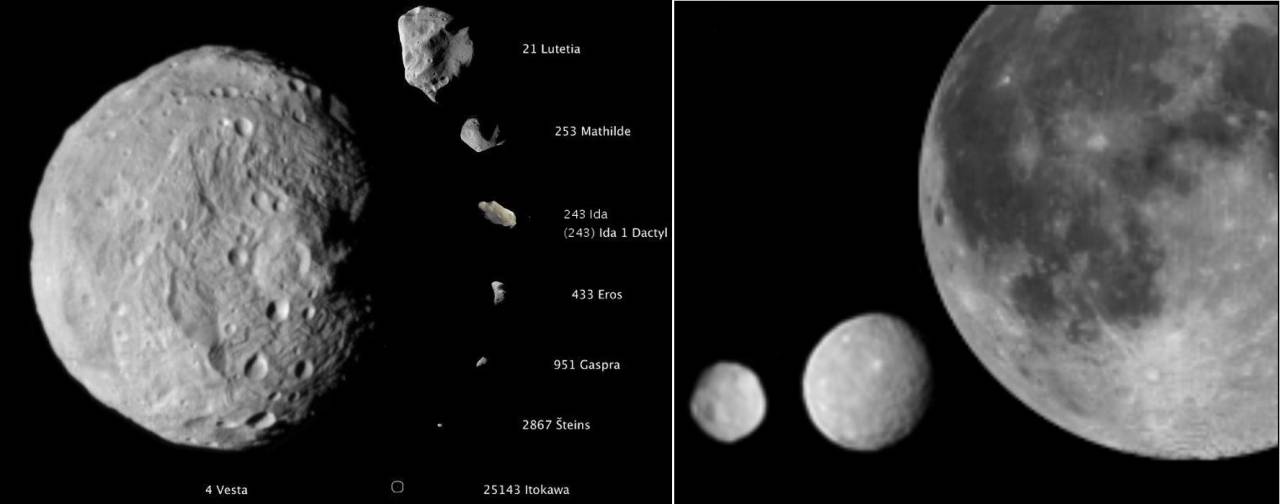 Размеры астероидов, слева: от большего к меньшему: (4) Веста, (21) Лютеция, (253) Матильда, (243) Ида и её спутник Дактиль, (433) Эрос, (951) Гаспра, (2867) Штейнс, (25143) Итокава. Справа: сравнительные размеры астероида Весты (525 км), карликовой планеты Цереры и Луны.