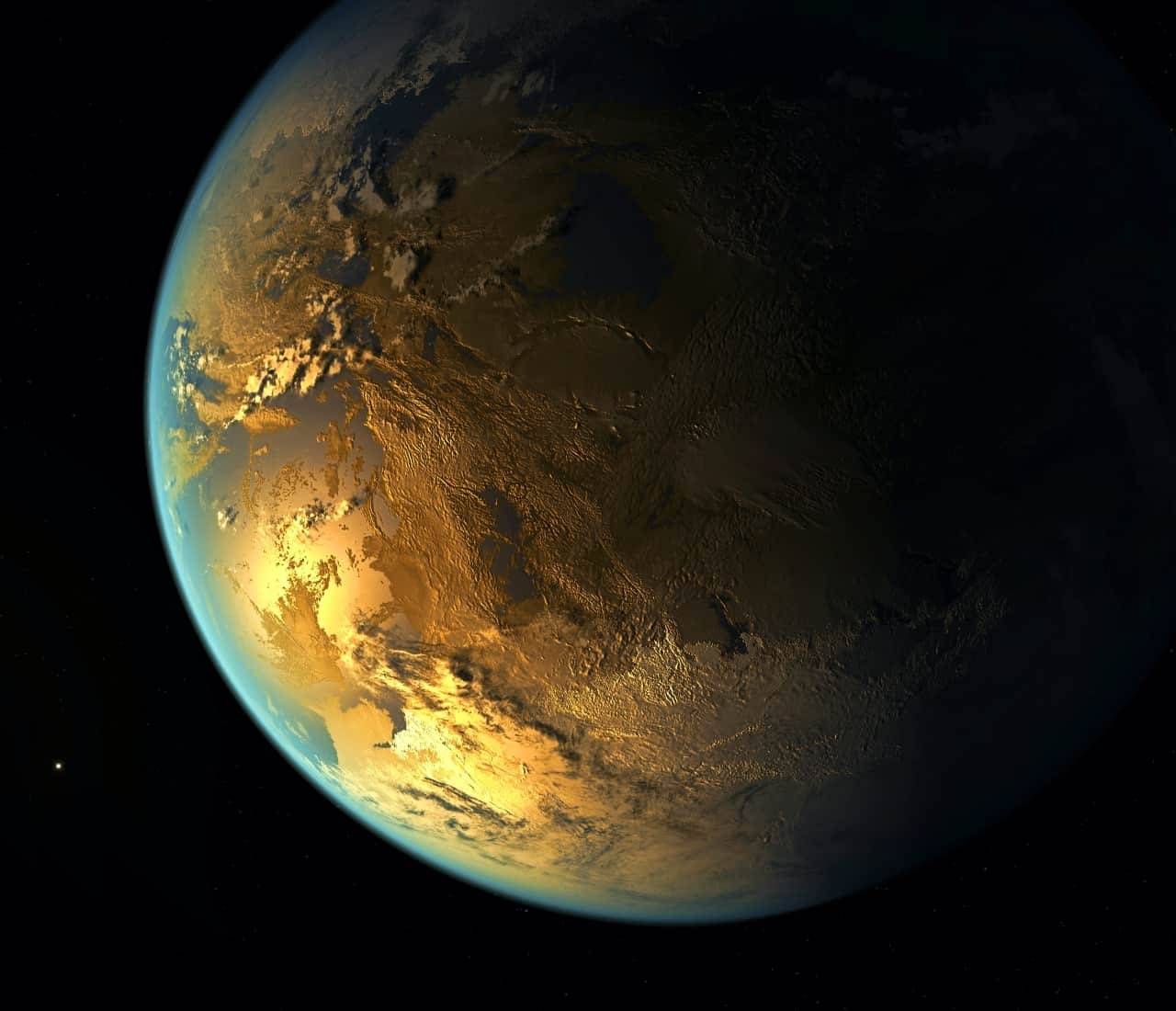 Художественное изображение планеты Kepler-186f. Это экзопланета, которая вращается вокруг красного карлика Kepler-186 в созвездии Лебедя. Учёные называют Kepler-186f «сестрой Земли» из-за сходства: радиус планеты близок к земному, но больше его на 13%, а масса в 1,4 больше массы Земли.