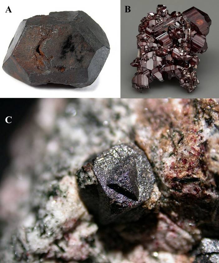 Минералы титана: ильменит (A), рутил (B) и лопарит (C). Изображение с сайта mindat.org