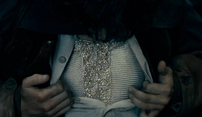 Кадр из первого фильма трилогии «Властелин колец», на котором Фродо демонстрирует спутникам кольчугу из мифрила сразу после удара копьем пещерного тролля. Она не пробита, а у Фродо явно нет серьезных травм