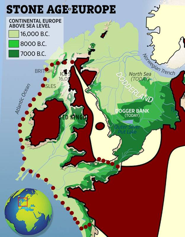 Доггерлэнд – огромная территория, заселенная людьми и затонувшая в мезолите. На ее территории расположилось Северное море Атлантического океана. По современным данным, эта суша погибла не позднее 5000-х гг. до н.э. и на ее месте образовалось мелководное Северное море. Коричневым цветом отмечен ареал распространения мегалитов, охватывающий эту территорию с трех сторон.