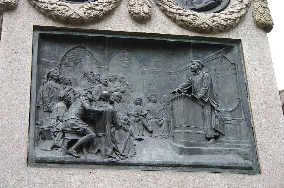 Диспут в Оксфорде, барельеф на постаменте памятника в Риме