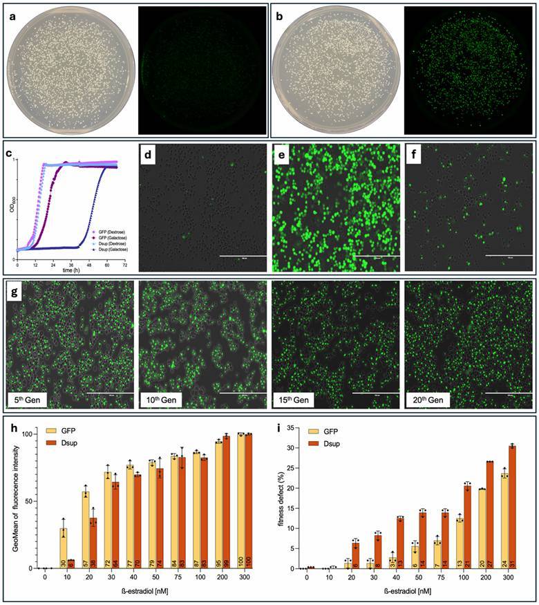 Обзор экспрессии Dsup в дрожжах (a, b) Фотографии и флуоресцентное сканирование чашек Петри с дрожжами: в колониях с pTDH3 Dsup-GFP сигнал отсутствует (экспрессия подавлена), в то время как контрольные колонии только с GFP демонстрируют яркое свечение. (c) Кривые роста штаммов с плазмидами GFP или Dsup-GFP в среде с 2% декстрозы или 2% галактозы (мониторинг по оптической плотности при 600 нм). (d, e) Клетки Dsup-GFP и контрольные клетки GFP в конце логарифмической фазы роста (при OD ≈ 0.9). (f) При использовании промотора pGAL1 в среде с галактозой 97% клеток (94 из 97), вырабатывающих Dsup-GFP, демонстрируют остановку клеточного цикла в фазе G2/M. (g) Флуоресцентные изображения показывают, что экспрессия Dsup-GFP остается стабильной при непрерывном культивировании в течение как минимум 20 поколений (масштабная линейка: 100 мкм). (h) Дозозависимая активация Dsup-GFP и контрольного GFP: уровень свечения напрямую зависит от концентрации β-эстрадиола. Значения нормализованы относительно максимального уровня экспрессии. (i) Дефект роста (fitness defect), вызванный присутствием Dsup и контрольного GFP при увеличивающихся концентрациях β-эстрадиола. Данные представлены как среднее значение +- s.d. для биологических повторов.