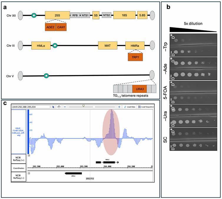 Специфическое подавление активности генов (сайленсинг) в различных участках генома дрожжей (a) Схема эксперимента: В штамме LPY4654 три «контрольных» (репортерных) гена встроены в разные части генома: ADE2-CAN1 в область рибосомной ДНК (хромосома XII), TRP1 в скрытый локус HMRa (хромосома III) и URA3 рядом с теломерой (хромосома V). В обычном состоянии эти участки упакованы плотно, и гены в них «молчат». Если упаковка разрыхляется (деплеция нуклеосом), гены активируются. Рост дрожжей на селективных средах показывает, сохраняется ли «режим молчания» в присутствии Dsup. (b) Тесты на выживаемость (серийные разведения): Сравнение роста культур на полной и селективных средах. Обозначение D⁻ соответствует отсутствию белка Dsup (0 нМ эстрадиола), D⁺ — его активной выработке (75 нМ эстрадиола). Разница в росте на среде -Trp наглядно демонстрирует, как Dsup усиливает подавление гена в локусе HMR. (c) Профиль плотности хроматина (MNase-seq): Сравнение степени «открытости» ДНК в области HMRa. По оси Y отложен уровень занятости (плотности упаковки) хроматина. Красный овал выделяет зону, где в присутствии Dsup упаковка становится значительно плотнее, что делает этот участок ДНК недоступным для считывания информации.