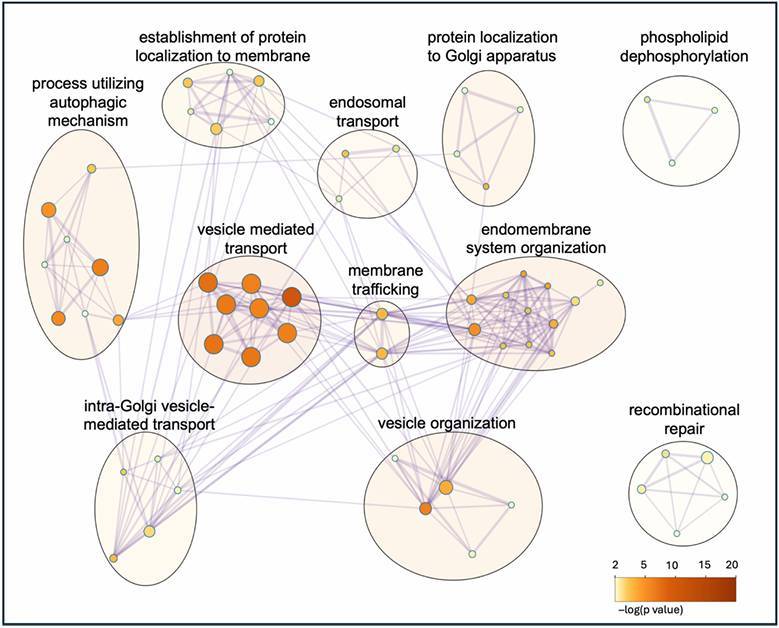 Анализ биологических процессов и путей мутантов, выживаемость которых повысилась благодаря Dsup при воздействии блеомицина. На схеме показано, какие функциональные группы генов позволяют дрожжам эффективнее справляться со стрессом в присутствии белка тихоходки. Анализ выполнен с помощью платформы Metascape (p < 0.01, фактор обогащения > 1.5). Узлы (круги) на схеме соответствуют конкретным биологическим процессам. Кластеры: узлы объединены в группы на основе функционального сходства — то есть того, насколько сильно пересекаются списки генов, участвующих в этих процессах. Линии (ребра) между узлами отражают степень их близости: чем больше общих компонентов у двух процессов, тем выше их показатель сходства (показатель kappa score > 0.3). Фактически, эта сеть связей визуализирует «коалиции» клеточных систем (транспорт, метаболизм, восстановление ДНК), которые начинают работать эффективнее под защитой Dsup.