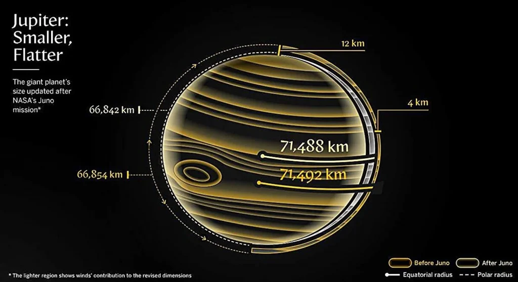 Результаты показали, что экваториальный диаметр Юпитера примерно на 8 км меньше, чем считалось ранее. При этом полярные области оказались более сплющенными: разница по сравнению с прежними оценками достигает 24 км. В итоге форма планеты оказалась более приплюснутой, чем предполагали астрономы.