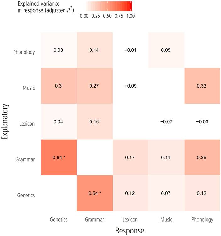 Рис. 2. Результаты анализа избыточности для связи между генетикой, музыкой и языками народов Северо-Восточной Азии, представленные в виде тепловой карты по показателю R2. Заметна средняя по силе связь между грамматикой и генетической структурой популяций. Рисунок из статьи H. Matsumae et al., 2021. Exploring correlations in genetic and cultural variation across language families in northeast Asia