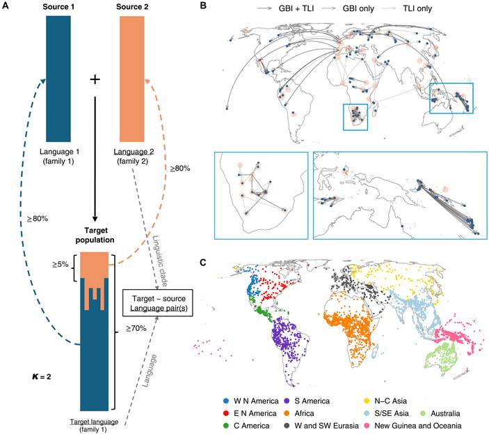 Рис. 3. Схема методики глобального исследования из обсуждаемой статьи. А — связи между языками представлялись в виде ориентированного графа, где популяция-источник и популяция-цель определялись по генетическому вкладу, а также учитывалась их генеалогическая классификация (популяции должны говорить на языках разных семей, чтобы исключить сходство из-за общего происхождения, — поэтому случаи, например, балканского или европейского языкового союза в глобальную выборку не попадают). На рисунке показана методика для простейшего случая, когда нынешняя популяция состоит из двух предковых компонент (K = 2). B — полный граф генетически вычисленных контактов между популяциями и языками: синие точки обозначают популяции-цели, а оранжевые — источники (которые на самом деле представляют собой совокупности популяций, говорящих на языках одной группы близкородственных идиомов, — просто здесь они центрированы по одному языку для облегчения визуализации). Всего было насчитано 126 пар «источник-цель». C — все языки, данные по которым были использованы в исследовании, — отмеченные на карте и раскрашенные по географическому региону