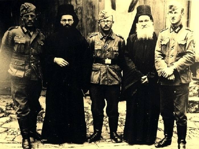 Еще до прихода «спасителей» гитлеровцев в 1941 г. на греческих монастырях висели вывески, написанные большими буквами: «Адольф, великий царь Европы!» Большой портрет Гитлера, в виде картины, висел в монастыре Ксиропотам, его фото представлено в книге, подготовленной членами немецкой экспедиции. А ведь их никто не принуждал к такой «афонской святости». При этом прослеживается интересная наследственная закономерность в связи с современностью.
