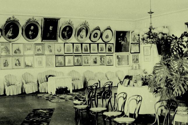 «Царские покои» Русского Свято-Пантелеимонова монастыря на Афоне. Зал торжественных приемов в 1941 г. Во втором ряду портретов (пятое фото слева) фотоизображение Адольфа Гитлера