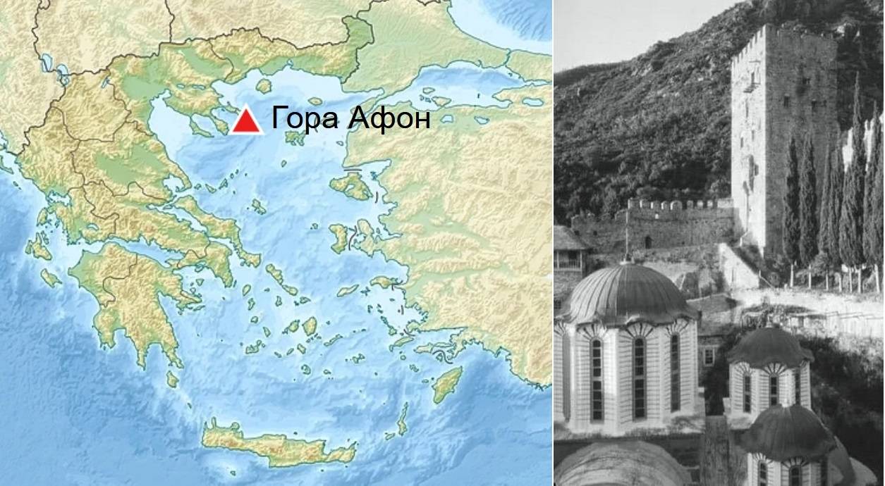 Афон (в греческих источниках Святая Гора), гора и крупнейшее в мире средоточие православного монашества на полуострове Айон-Орос на северо-восточном побережье Греции. Гора Афон, 1930-е годы