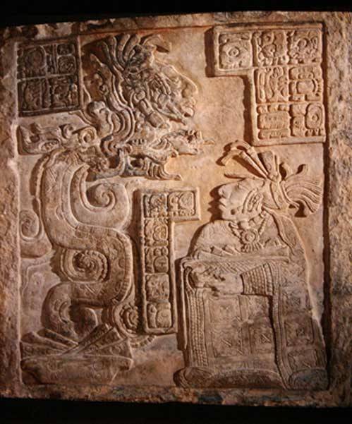 Надгробие 15, ныне хранящееся в Британском музее, на котором изображена одна из жён Ягуара IV, призывающая Змея-Провидца во время обряда кровопускания. Город майя Яшчилан, Мексика.