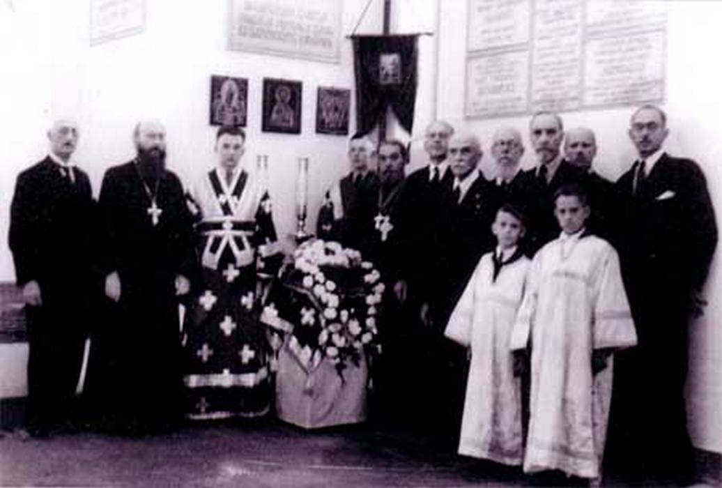 После панихиды 4/17 июля 1943 г. Слева направо: Э.Н. Фричеро, прот. Иоанн Григор-Клочко, В. Котляревский, М. Котляревский, кн. П.Б. Щербатов, кн. М.А. Черкасский, В. Кусонский, граф П.Н. Апраксин, А. Слободской, А.В. Гладков, Н.А. Всеволожский.