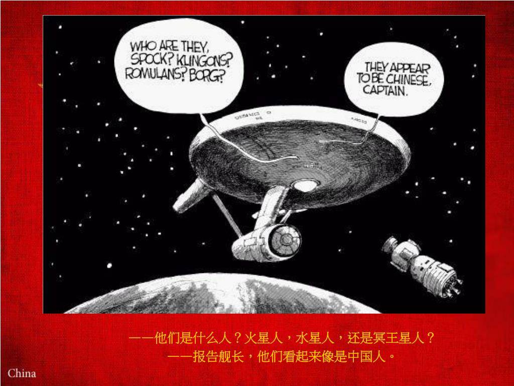 Пародия на сериал «Звездный путь»: Капитан межпланетного корабля «Энтерпрайз» спрашивает одного из персонажей: «Кто они, Спок? Ромуланы (гуманоидная раса с планеты Ромулус)? Клингоны (воины-гуманоиды из планеты Кронos)? Борги (раса кибернетических организмов)? — Похоже, это китайцы, капитан. Надпись на китайском: — Кто они? Марсиане, меркурианцы или плутонианцы? — Капитан, они похожи на китайцев.