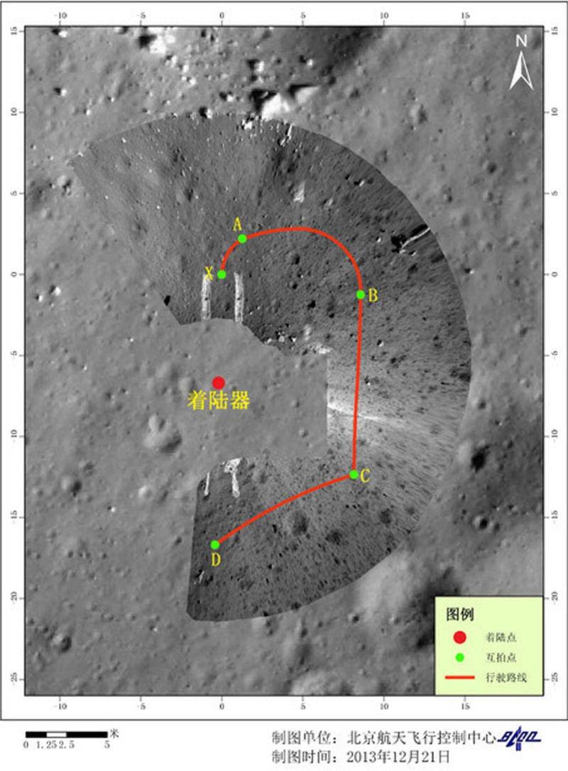 Как отмечалось ранее, первоначальный опубликованный план китайской миссии предусматривал, что «Чанъэ-3» совершит посадку, развернёт «Кролика» у его основания… а затем луноход совершит большой «разведывательный полукруг» вокруг него. При этом каждый космический аппарат будет делать снимки другого, а луноход будет останавливаться примерно через каждые 60 градусов, прежде чем перейти к следующей «фотостанции» (см. ниже).