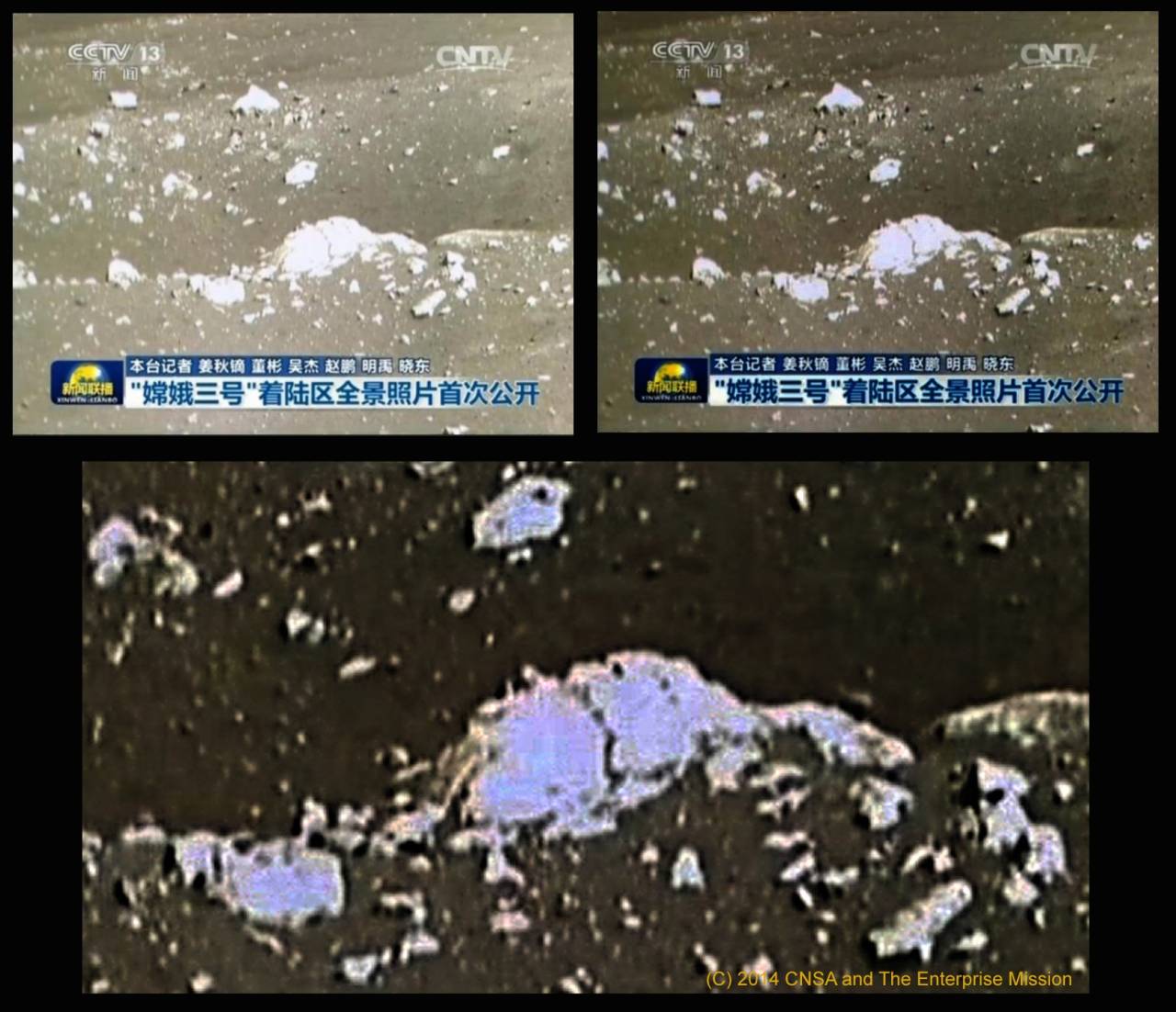 Когда части этой круговой панорамы были «захвачены» Энтерпрайзом (когда она «увеличивалась» в интервью китайскому телевидению), уровень цветопередачи, разрешения и детализации был заметно хуже, чем на «трёх или четырёх отдельных кадрах», опубликованных в качестве официальных снимков Чанъэ-3 за неделю до этого!
