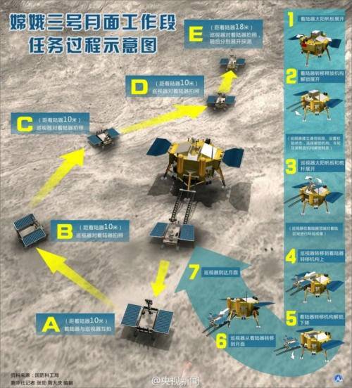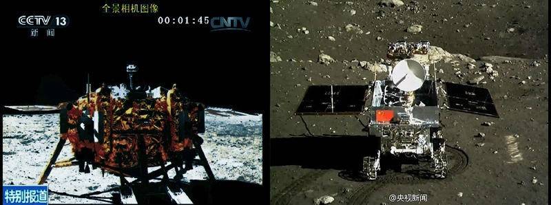 В то же время план Центра управления полётами предусматривал получение изображения затенённой стороны спускаемого аппарата «Чанъэ-3» (внизу слева) … с помощью двух «панорамных камер» «Нефритового кролика».