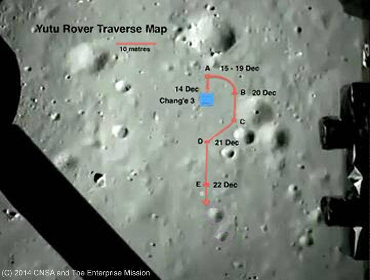 — пока «Кролик» не достигнет позиции «D» (ниже) — где он сможет сфотографировать Чанъэ-3 с его хорошо заметным «китайским национальным символом» на освещённой солнцем (южной) стороне посадочного модуля…