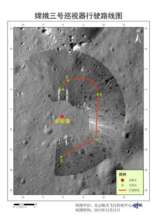 Сразу после успешного запуска «Нефритового кролика» китайцы планировали, чтобы каждый из (теперь уже) независимых «лунных аппаратов» сделал серию взаимных снимков — посадочный модуль и луноход… Съёмка лунохода. Посадочный модуль — когда «Нефритовый кролик» медленно описал полукруг вокруг посадочного модуля (с севера на юг, на перевёрнутой картинке — см. ниже) — он останавливался каждые 60 («тетраэдрических»…) градусов, чтобы сделать снимки, перемещаясь от «A» … к «B» … к «C» и т. д.